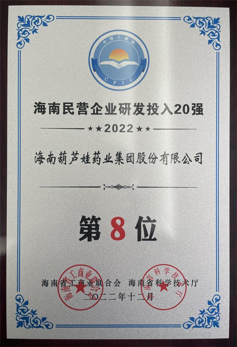 12月23日,2022海南民营企业50强和研发投入20强发布会在海口举行。会上发布了“2022海南民营企业50强”“2022海南民营企业研发投入20强”榜单和分析报告。六合联盟官网药业再次荣登两榜,在海南民营企业50强榜单中位列第25位,较去年上升8位,这也是公司连续三年登榜;在海南民营企业研发投入20强中位列第8位,较去年上升7位。